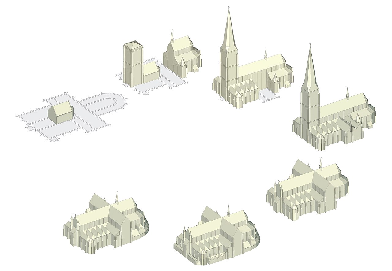 Bouwstadia van de Pieterskerk tekening: architectenburo Veldman-Rietbroek In 1339 werd de kerk vergroot en in 1350 werd er een toren gebouwd, die de ‘Coningh der Zee’ of ook wel de ‘Sterre der Zee’ werd genoemd omdat hij als baken voor de schippers diende. Op een schilderij van rond 1500 is de kerk met toren te zien. Het is de enige afbeelding van de toren. Uit bouwsporen valt af te leiden dat de toren beslist een andere vorm moet hebben gehad. Volgens historische beschrijvingen zou de toren ongeveer honderd meter hoog zijn geweest. Daarover bestaat geen zekerheid. Het is zelfs heel onwaarschijnlijk omdat de aangetroffen fundering van de toren veel te klein is voor zo’n hoog bouwwerk.