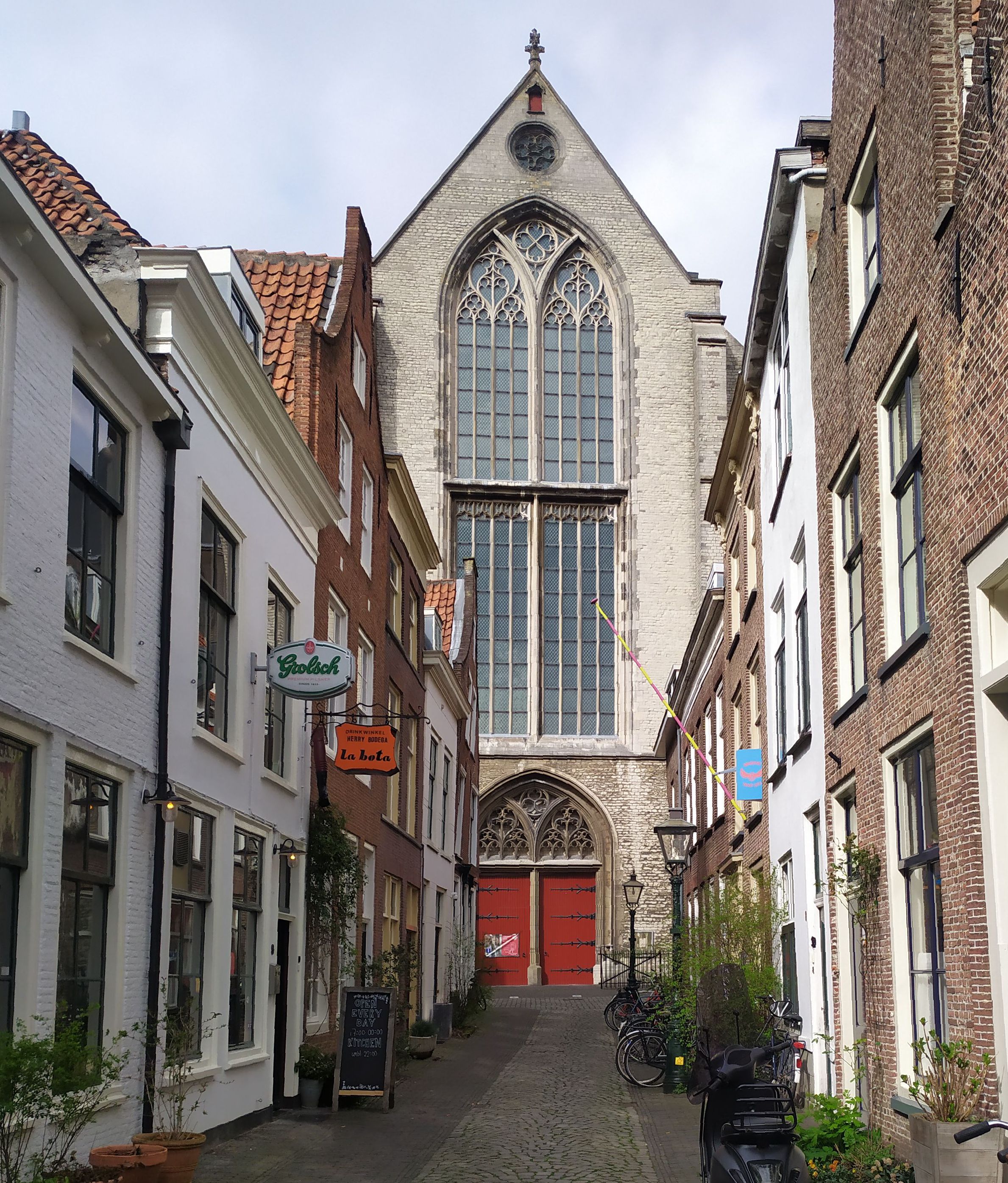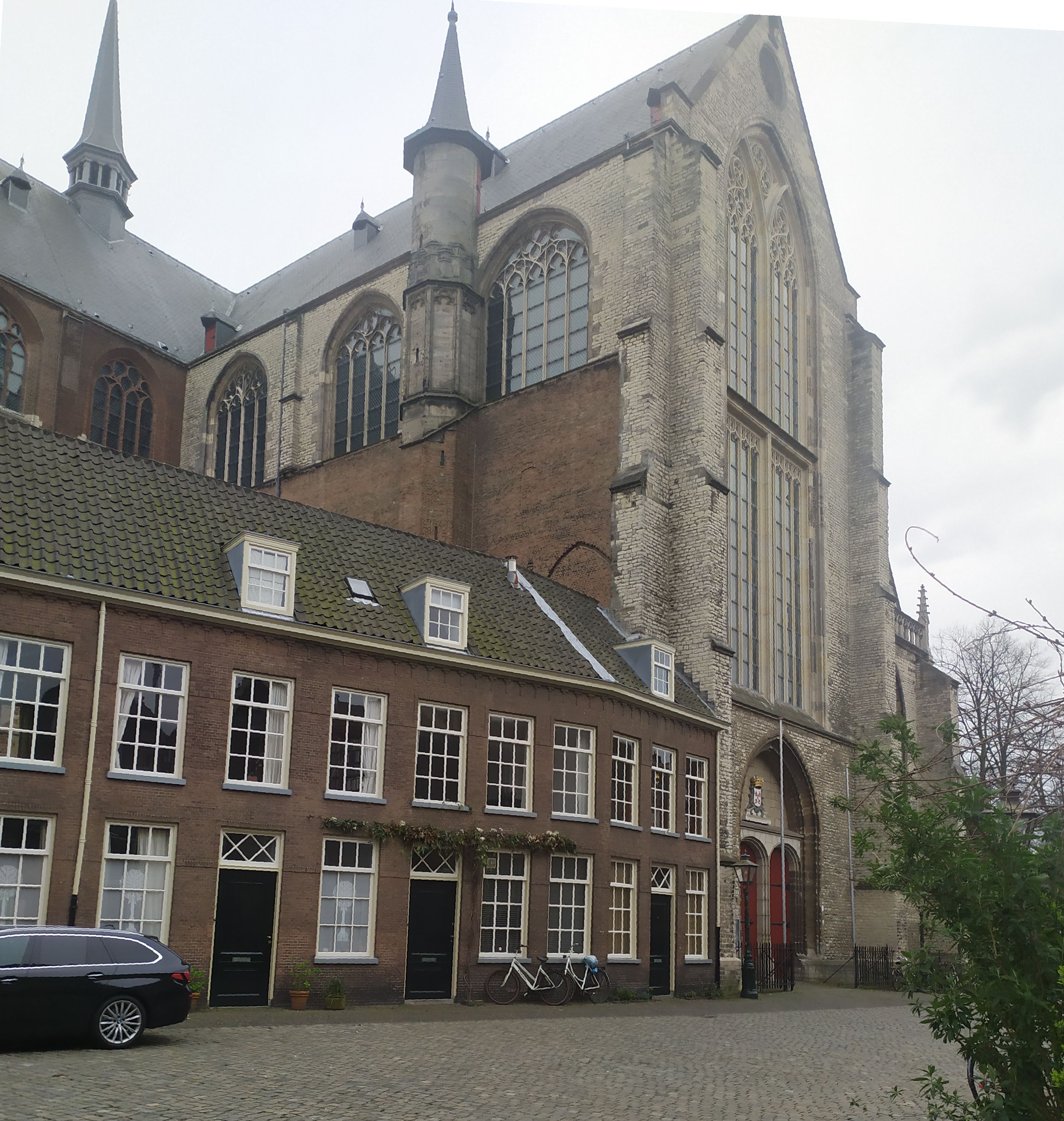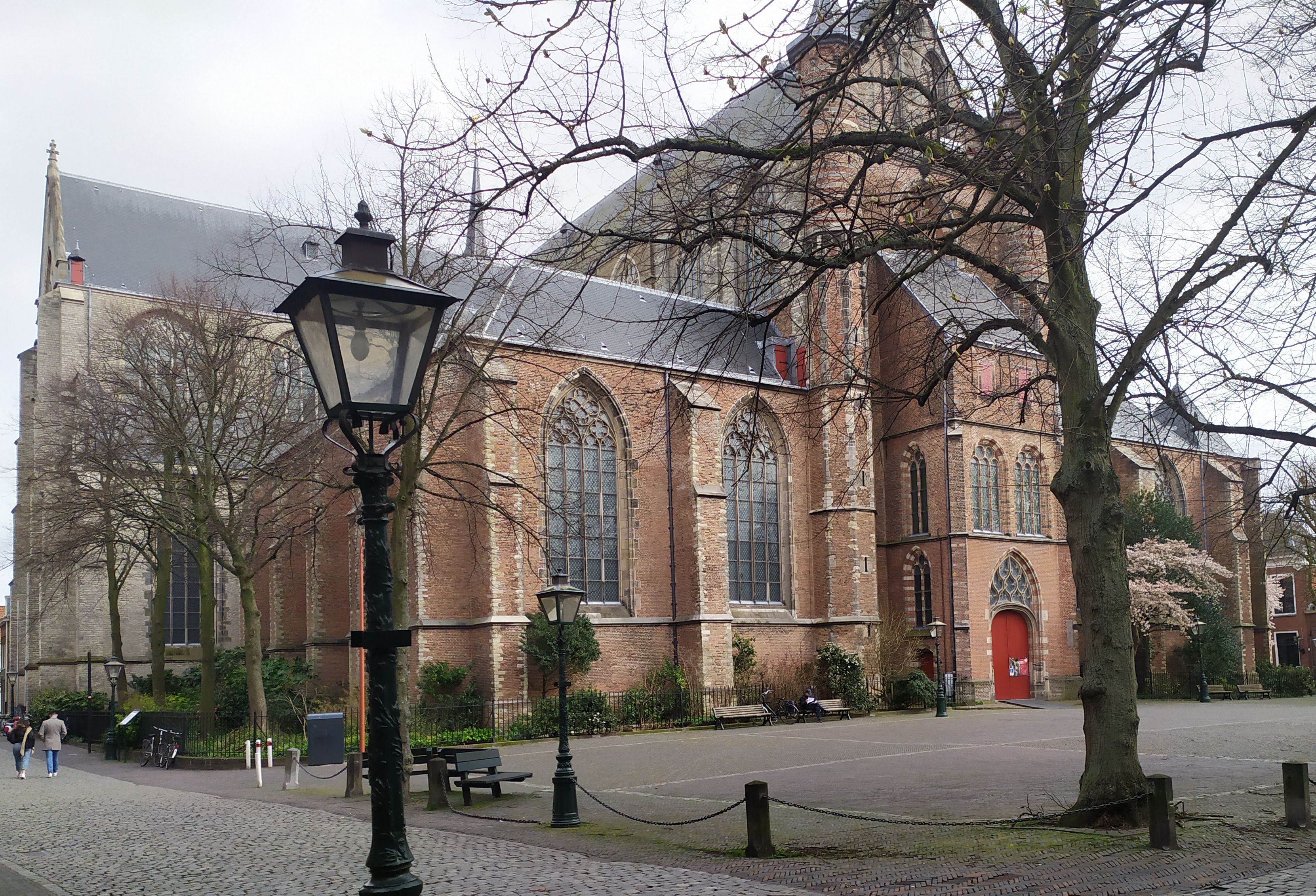 Pieterskerk, Kloksteeg 16, Pieterskerkhof 1a - 1955 - foto: Herman Kleibrink De Pieterskerk is de oudste kerk van Leiden en het is altijd de hoofdkerk geweest. De twee sleutels in het stadswapen van Leiden verwijzen naar Sint Pieter als bewaker van de hemelpoort. Het stadswapen is te zien boven de ingang aan de noordzijde. De kerk staat in oost-westrichting met het koor op het oosten. Op de foto hierboven is de westgevel te zien. De geschiedenis van de Pieterskerk begint met de inwijding van een kapel, gewijd aan Petrus en Paulus in het jaar 1121. Er wordt maar een keer vermeld dat de kapel ook aan Paulus was gewijd. Oorspronkelijk behoorde de kapel bij het grafelijk hof. Floris V werd hier gedoopt. In de loop van de dertiende eeuw werd de kapel ook gebruikt door omwonenden. In 1268 verhuisde het grafelijk hof naar ’s Gravenhage en werd de kapel parochiekerk. Van de kapel is geen beeldmateriaal bekend. Ter plaatse van het schip van de kerk zijn bij de restauratie van 1977-1982 restanten gevonden die vermoedelijk deel uitmaakten van deze kapel.
