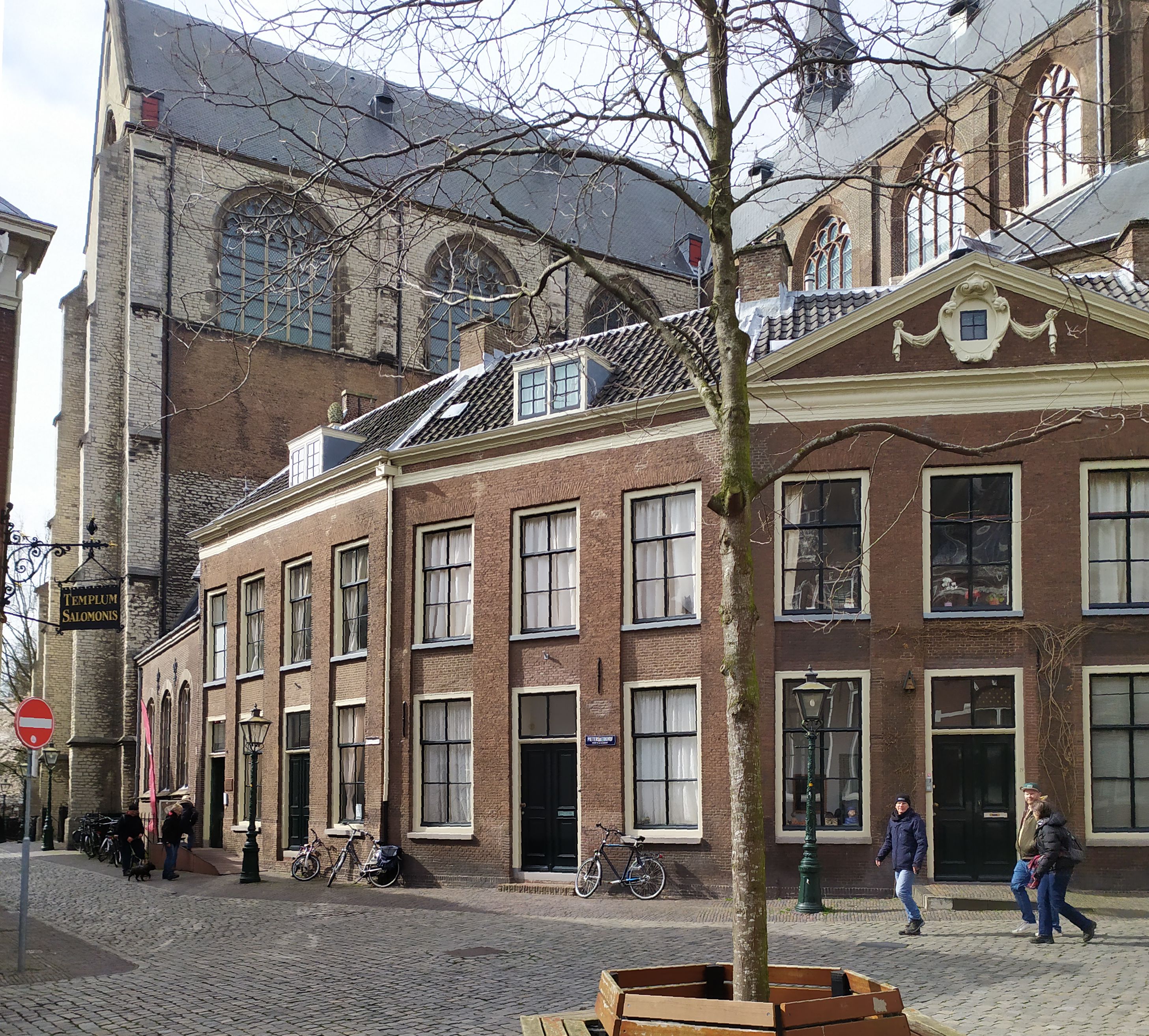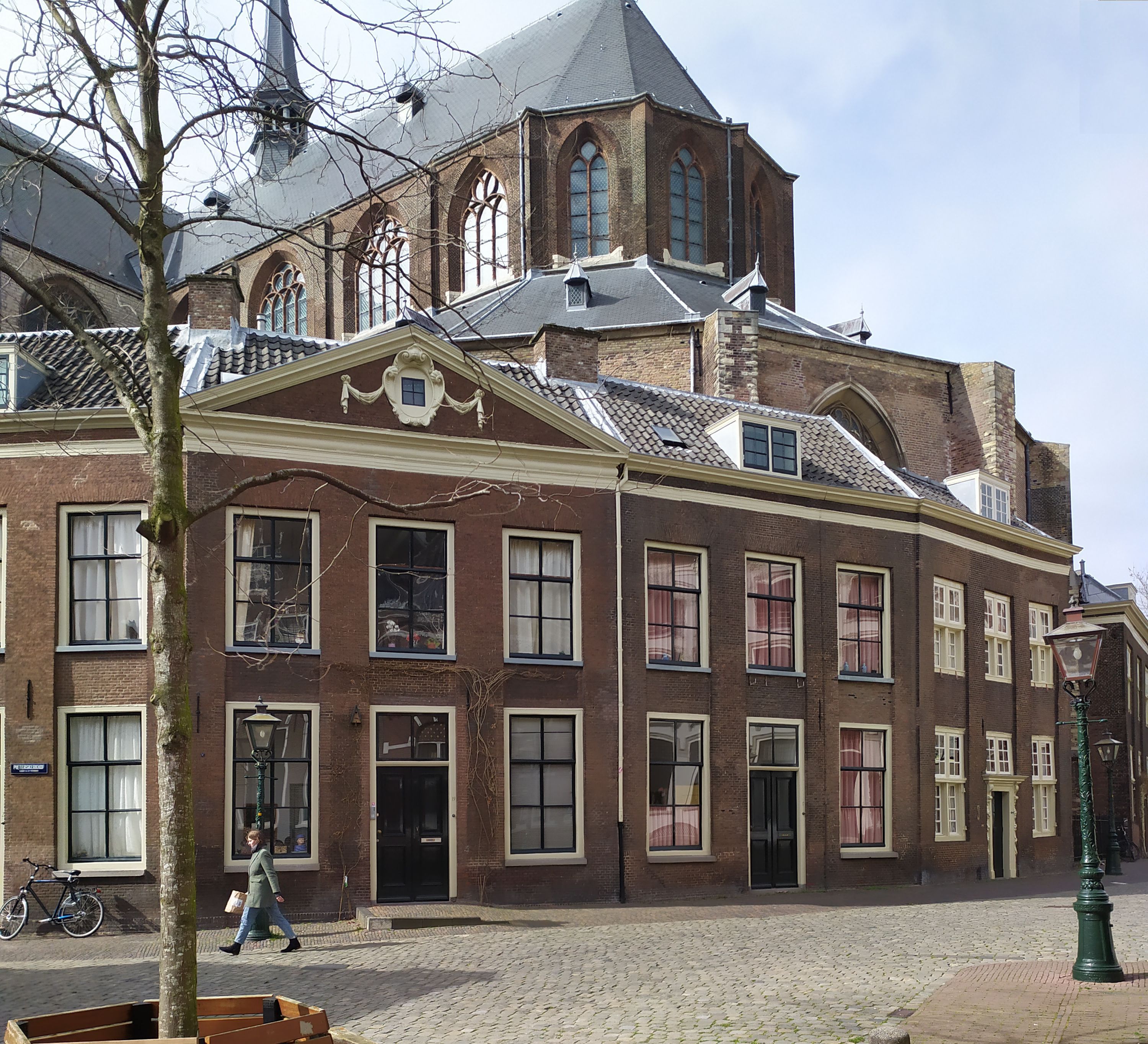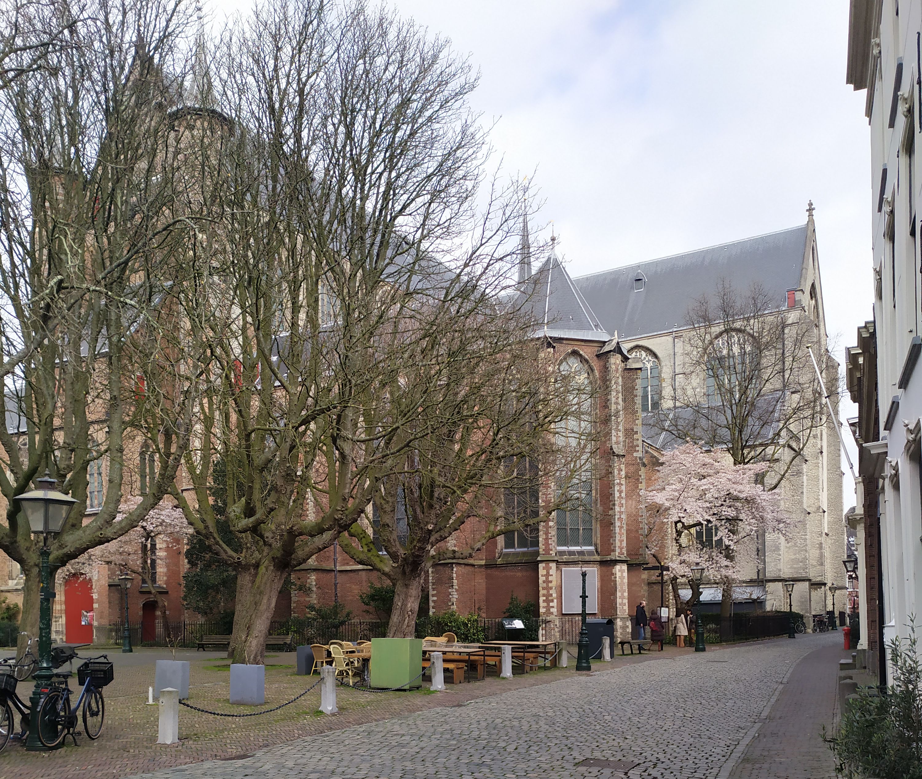 Pieterskerk, Kloksteeg 16, Pieterskerkhof 1a - 1955 - foto: Herman Kleibrink De Pieterskerk is de oudste kerk van Leiden en het is altijd de hoofdkerk geweest. De twee sleutels in het stadswapen van Leiden verwijzen naar Sint Pieter als bewaker van de hemelpoort. Het stadswapen is te zien boven de ingang aan de noordzijde. De kerk staat in oost-westrichting met het koor op het oosten. Op de foto hierboven is de westgevel te zien. De geschiedenis van de Pieterskerk begint met de inwijding van een kapel, gewijd aan Petrus en Paulus in het jaar 1121. Er wordt maar een keer vermeld dat de kapel ook aan Paulus was gewijd. Oorspronkelijk behoorde de kapel bij het grafelijk hof. Floris V werd hier gedoopt. In de loop van de dertiende eeuw werd de kapel ook gebruikt door omwonenden. In 1268 verhuisde het grafelijk hof naar ’s Gravenhage en werd de kapel parochiekerk. Van de kapel is geen beeldmateriaal bekend. Ter plaatse van het schip van de kerk zijn bij de restauratie van 1977-1982 restanten gevonden die vermoedelijk deel uitmaakten van deze kapel.